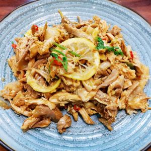 柠檬切数片后其余挤出汁,与香菜一起放入撕好的鸡肉中。