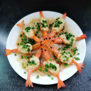 虾上面加蒜蓉,冷水入锅,水开后蒸6分钟。