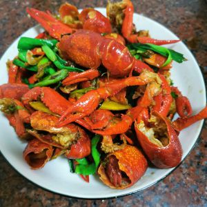 倒入小龙虾爆炒,加香辣酱,黄豆酱,少许酱油继续翻炒