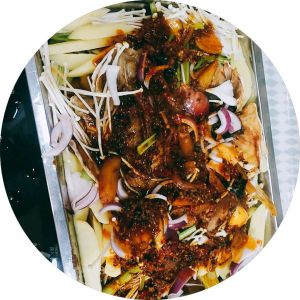 烤鱼的时候把酱料做好,炒鱼剩的油烧热,把大蒜和葱丝放入煸炒,将火锅底料炒化,放入郫县豆瓣酱,生抽,糖,盐,中小火炒匀后把不好熟的菜加入锅里翻炒几下,加入一些水,水开后再煮两到三分钟即可关火