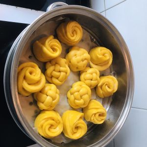 排气后,擀成5张皮中间压一下卷一下切2半,也可以做别的形状。