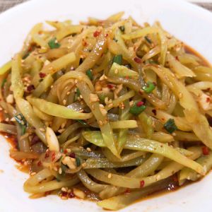 莴笋切丝,放一勺子盐拌匀。腌制半小时,挤干水分。