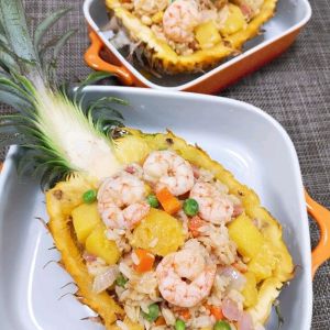 待米饭炒散后,将搅拌好的鸡蛋液倒入热米饭中,边倒边翻炒,直到炒散。再加入沥干水的菠萝,炒好的虾仁倒入锅中,放适量的盐和生抽,蚝油,一起翻炒。炒好后盛入事先备好的菠萝壳中即可。