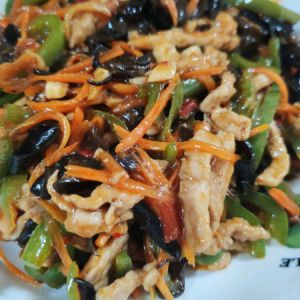 锅热放油,先将肉炒至变色,盛出待用。小火炒香葱姜蒜,初香味后加入郫县豆瓣酱(喜欢辣可以多放)炒香,加入木耳青椒胡萝卜丝,翻炒一下,再加入炒至好的肉,翻炒一分钟。加入调料汁,翻炒均匀,再加入水淀粉将菜调到自己喜欢的稠度即可。关火出锅