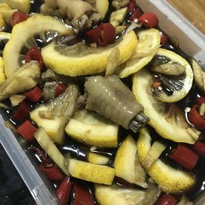 柠檬盐水洗皮,切好辣椒、姜丝、柠檬去籽待用。