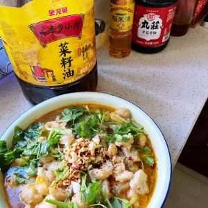 鱼肉放入锅中,用筷子划散,煮熟带汤一起放入盆中的菜上。码上葱蒜,辣椒,烧热菜籽油,淋上