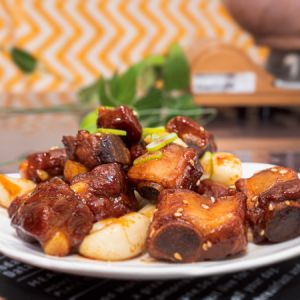 出锅前放一点葱花,撒少量盐和白芝麻,蒜香红烧排骨就做好啦