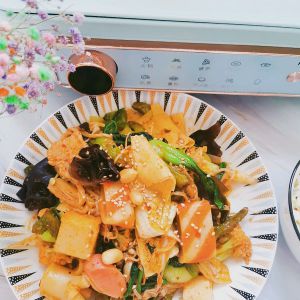 炒好后加入蔬菜类➕丸子类➕菌类煸炒