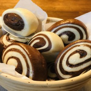 除盐和油外的其他料放揉面盆里揉面开始揉面。放厨师机里揉或手工揉面。成团后放入油和盐继续揉到面团光滑。取出一半面团放在干净面盆里盖上保鲜袋发酵60-70分钟。另外一半的面团加可可粉和水继续揉光滑。