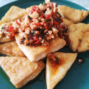 煎豆腐的油大火烧热倒入调料碗里,少用些油,喜欢醋的朋友可以加小点香醋。