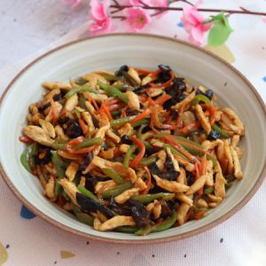 放入胡萝卜丝,青椒丝,木耳丝翻炒2分钟
