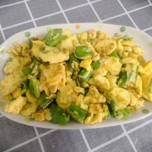 锅里倒油,先把青椒炒软,然后把蛋液倒进去,等鸡蛋差不多凝固的时候,开始炒,把鸡蛋炒碎,我喜欢焦一点的鸡蛋,所以炒的时间有点久。炒的差不多了就加一勺盐,半勺生抽调个味,然后装盘开动吧!