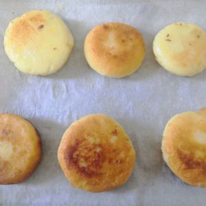 手上抹点植物油防粘,然后取一小块面糊揉圆,压成圆饼状。照这个方法把所有面糊都压成圆饼(大约可以做6-8个)
