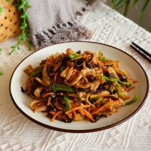 准备配菜:胡萝卜、木耳、青椒切丝备用