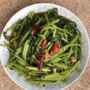锅里放油烧热,加入茼蒿大火爆炒。茼蒿炒倒,加入生抽和蚝油翻炒,再加入干辣椒段和蒜末