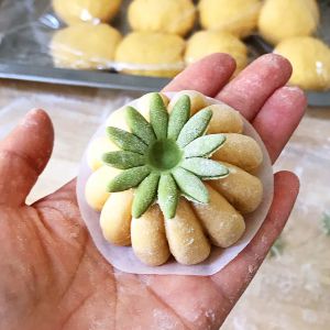 这是用菠菜汁发的面 是上一次用剩下的冻冰箱里 用的时候提前拿出来化开就可以用了 借用翻糖模具按压你喜欢花朵大小