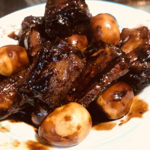 煎好排骨后加入佐料爆香,加入蚝油生抽老抽和一碗水小火慢炖20分钟