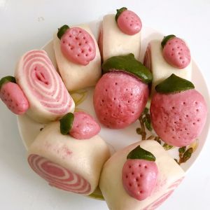 从粉色的面团取出3分之一的面团(做草莓形状),另一半多的粉色面团做卷馒头