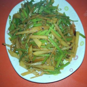 爆香后加入过了水的土豆丝,翻炒。2分钟左右加入西芹,再加适量水,200ml.翻炒