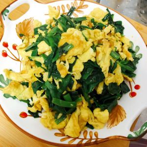 鸡蛋炒好后,放在锅里一边,这样鸡蛋不容易炒散。放入韭菜,变软就可以和鸡蛋一起炒,放盐、味精、一点点味极鲜酱油。继续翻炒两分钟。