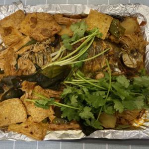 烤鱼:烤箱200度预热,将腌好的鱼肚子中的料掏出,留少量葱段和姜片,鱼身上抹食用油胡椒粉与孜然粉,烤盘上放锡纸,锡纸上也涂抹食用油以防粘连,放入烤箱中层,230度烤25分钟。
