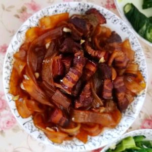 加入蒜,出锅装盘,一盘美味的红烧肉炖粉条就完成了,盛碗米饭赶紧享用吧!