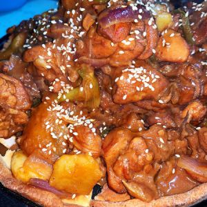 炒至鸡块上色均匀,加入土豆和青椒,翻炒