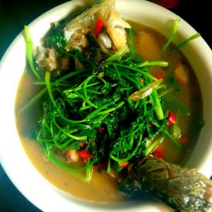 准备大碗将鱼和酸菜盛出。香菜在汤里烫熟盖在鱼上面。