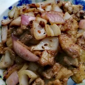 锅里留少许油,放入孜然粉和洋葱翻炒,放入少许盐和酱油