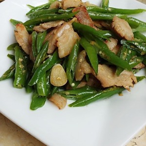 待肉片出油有点卷的时候,加入小青椒,炒至断青。