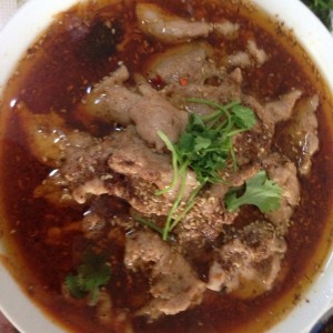 把花椒碎和芝麻撒肉上,锅底放红辣椒和花椒炒香再加油烧热,用漏勺把热油过肉上.