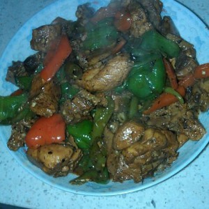 加入鸡块翻炒,然后放盐,老抽,料酒炒几下,加入尖椒翻炒,加盖焖2分钟