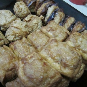 豆腐一开二酿好, 煎熟,茄子苦瓜前部酿好煎熟。