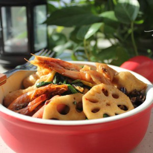 放鲜虾翻炒,然后放入焯好的各种丸子炒匀