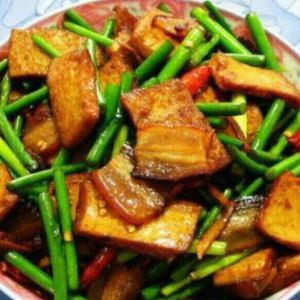 油热后下蒜片炒香,腊肉下锅,加一点酱油翻炒,再加入蒜苔,鸡精味精盐糖调味翻炒即可出锅。