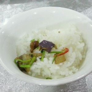 炒锅放油,热锅,待油温合适倒入茄丁、肉末、小米辣一起翻拌,加入盐提味,加少许酱油提色。