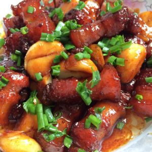 就着锅中的油加入适量白糖,小火将糖炒至焦糖色稠状,倒入煸好的五花肉裹上糖色。
