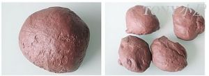 面团放在案板上,再次揉面后把面团分成4等份,让其静置5分钟松弛一下好擀开;