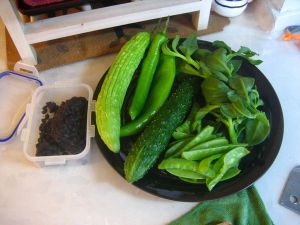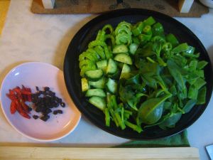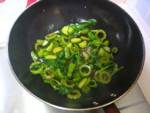 煸香豆豉 干辣椒 依次放入苦瓜 荷兰豆 青椒 黄瓜 穿心莲 每种隔几十秒越到后面时间缩短