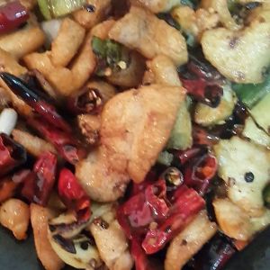 重新起锅,放入大约一煎勺的油,再放入刚才准备好的食材,小炒至辣椒呛鼻,花椒出香,就可放入鸡肉一起翻炒几分钟,起锅即可。