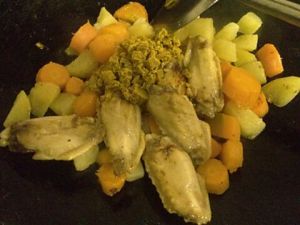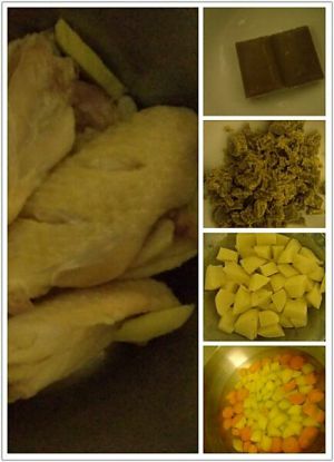 马铃薯和胡萝卜煮好后,把咖喱粒粒和鸡翅一起炒,等咖喱融化后,放入水刚好淹过鸡翅就可以了,和少许糖。