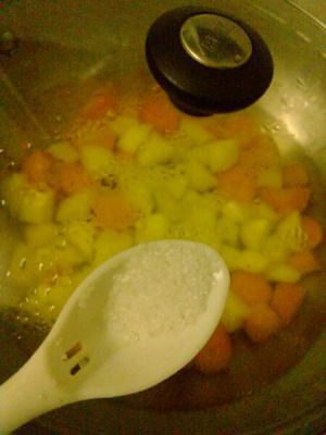 因为胡萝卜和马铃薯不一样,所以我是水滚时先放胡萝卜煮2分钟,然后再放入马铃薯一起煮,一共三分钟,放少许盐。