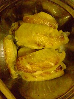 煮胡萝卜和马铃薯的时候用空余的时间,把鸡翅煎至金黄色。