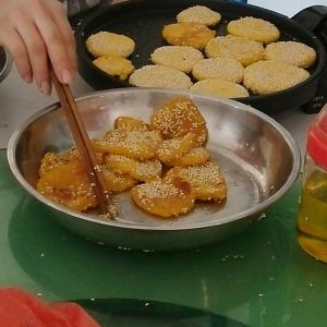 洒上芝麻,又香又甜的南瓜饼大功告成了