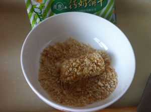 饼干弄碎,放入碗中。家里没有面包糠,用钙奶饼干代替的,效果也不错哈。很好吃的