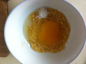 打入一个鸡蛋,少许盐,不用放糖哈,蛋卷本身有些甜的。一会的饼干碎也是甜的。搅成蛋糊