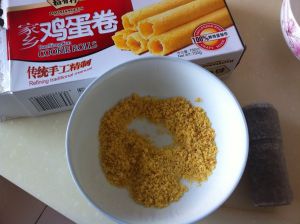 蛋卷弄碎。一盒蛋卷里好多碎的,我全倒出来了。尽量弄碎,要不一会不太好弄蛋糊。我用蒜臼子磨了下,好碎啊。