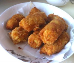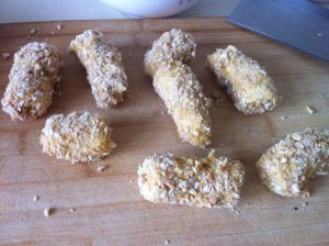 裹上蛋糊的香蕉放入饼干碎里,在裹上饼干碎。这步我就直接下手了,筷子不好使了。要轻轻的,否则不均匀