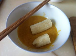 香蕉放入蛋糊中裹上蛋糊,我的香蕉太熟了,得很小心,很容易影响卖相