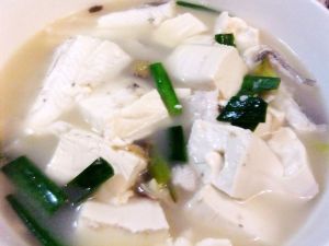 紧接着,豆腐切块入锅,依次加入少许盐、料酒、蒜叶,汤再次煮沸即可出锅啦。